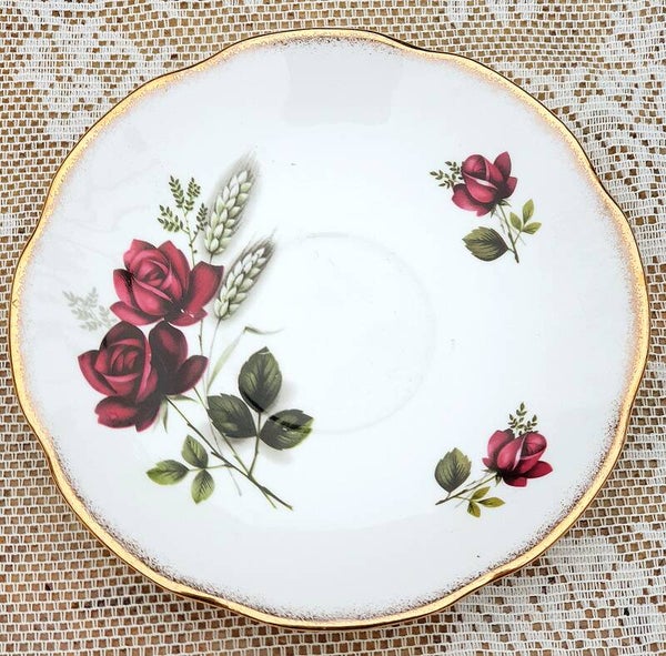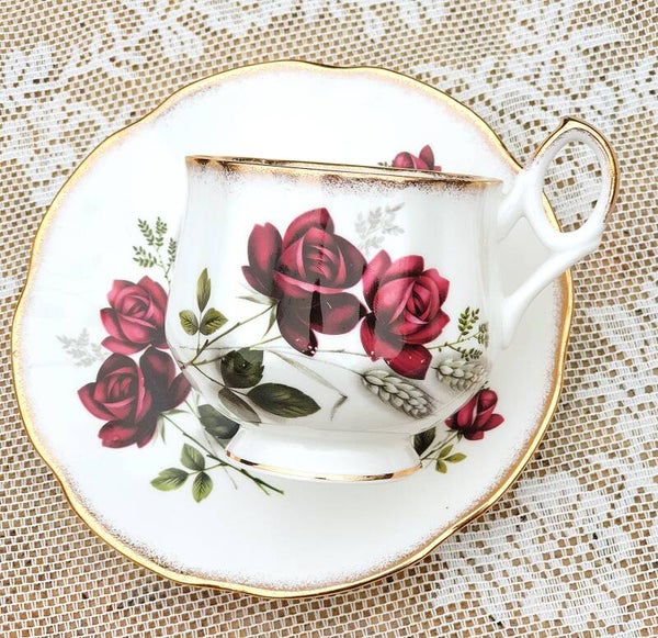 Het kopje en de schotel hebben een fijn reliëf en zijn versierd met rozen.