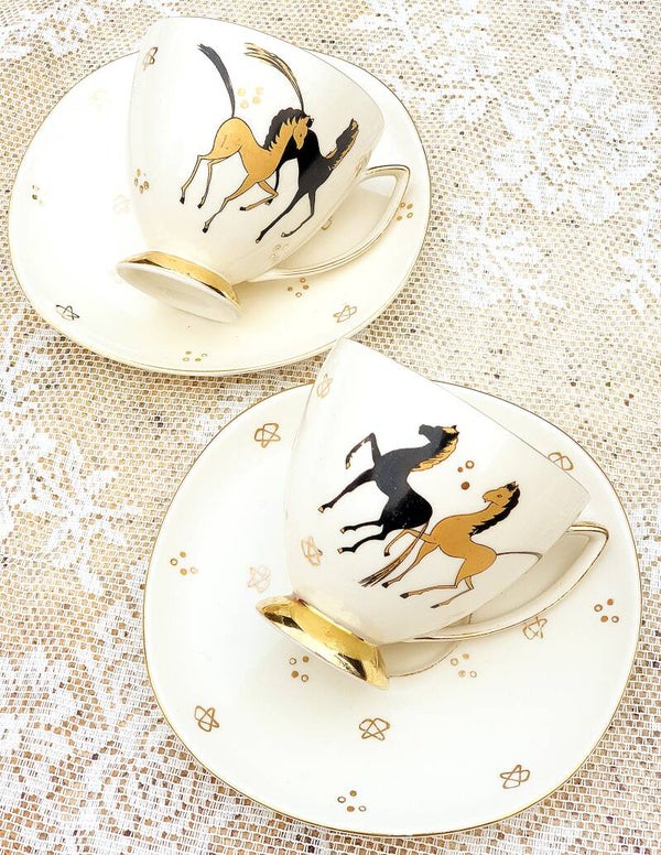 Twee bijzondere vintage kop en schotels met paarden en gouden accenten.