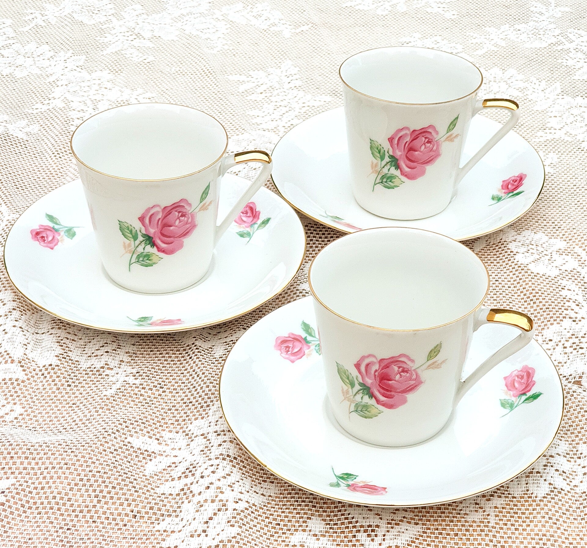 Sfeervolle vintage kop en schotels met warm gekleurde rozen.
