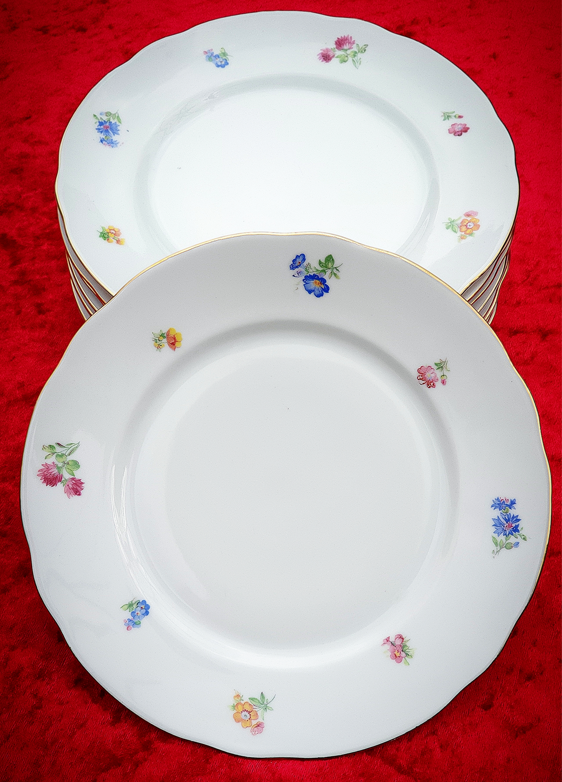 Vrolijke ontbijtborden met verschillende gekleurde kleine bloemetjes. De rand is geschulpt en heeft een gouden randje. Staat: perfect Kleur servies: wit Diameter: +/- 18.5cmMerk/ made in: Bavaria/ Duitsland Prijs is per 1 bord Ophalen of verzenden